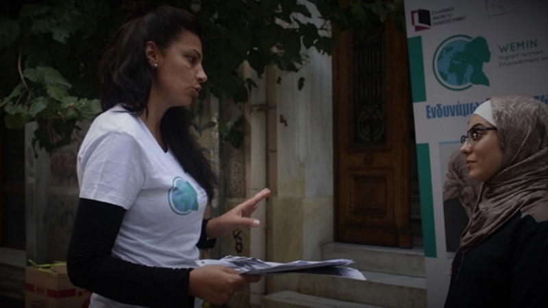 Στο πλαίσιο αυτό, το Ελληνικό Ανοικτό Πανεπιστήμιο – Ερευνητική Ομάδα DAISSy και η Ολυμπιακή Εκπαιδευτική και Συμβουλευτική ΕΠΕ διοργάνωσαν την Πέμπτη 1 Νοεμβρίου 2018 τη δράση «Μια σοκολάτα μας ενώνει!», στο πλαίσιο του Ευρωπαϊκού έργου WEMIN: Migrant Women Empowerment and Integration. Οι δύο φορείς πρόσφεραν σοκολάτες σε γυναίκες, σε συνοικία στο κέντρο της Αθήνας, όπου η πυκνότητα μεταναστών/στριων και προσφύγων είναι υψηλή, ζητώντας τους να προφέρουν τη λέξη “σοκολάτα” στην μητρική τους γλώσσα. Η δράση ήταν επιτυχής και μάλιστα, ορισμένες από τις μετανάστριες/πρόσφυγες επέλεξαν να προσφέρουν οι ίδιες τις σοκολάτες σε άλλες γυναίκες. Η αρχική διστακτικότητα των γυναικών εξελισσόταν σε χαμόγελο και τελικά σε δράση, προσφέροντας μια σοκολάτα και ζητώντας να γράψουν πάνω σε αυτή, τη λέξη «σοκολάτα» στη μητρική τους γλώσσα.