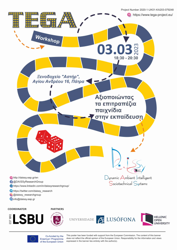 Η εκδήλωση διοργανώνεται στο πλαίσιο του Ευρωπαϊκού έργου: TEGA – Training the Educators to Facilitate the Teaching and Assessment of the Abstract Syllabus by the use of Serious Games