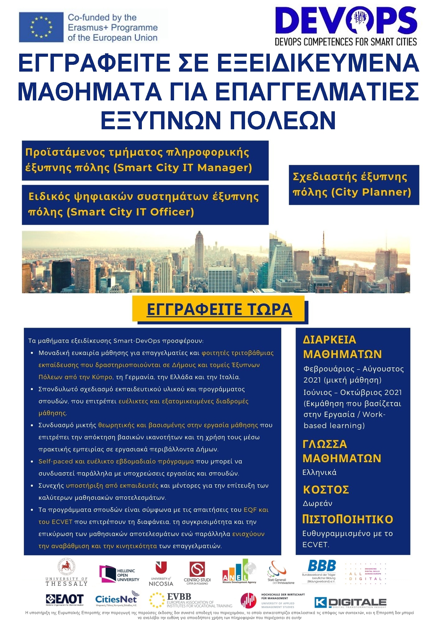 Περισσότερες πληροφορίες σχετικά με το Ευρωπαϊκό έργο DevOps competences for Smart Cities και την Ερευνητική Ομάδα DAISSy του ΕΑΠ, μπορείτε να δείτε σε: