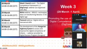 Ειδικότερα, ο Alteo Valentini από το EGINA, φορέα-εταίρο του BIBLIO, ανέλυσε το περιεχόμενο του έργου και τα ευρήματα σχετικά με ► τους δύο αναδυόμενους ρόλους εργασίας του/της Υπεύθυνου-ης Επικοινωνίας και Συμμετοχικότητας της Κοινότητας / Community Engagement and Communication (CECO) και Διαμεσολαβητή-τριας Ψηφιακού Μετασχηματισμού /Digital Transformation Facilitator (DIGY) ► τη μεθοδολογία του διαρθρωτού εκπαιδευτικού προγράμματος του BIBLIO που λαμβάνει υπόψη τα διαφορετικά επίπεδα ψηφιακών δεξιοτήτων των επαγγελματιών των Βιβλιοθηκών ► το Μαζικό Ανοικτό Διαδικτυακό Μάθημα (Massive Open Online Course–MOOC) του έργου που ολοκληρώθηκε με μεγάλη επιτυχία προσελκύοντας χιλιάδες συμμετοχές και ► τα Εξειδικευμένα Μαθήματα (Specialization Courses-SCs) που είναι σε εξέλιξη και θα οδηγήσουν στις εκπαιδευτικές δράσεις στο χώρο εργασίας.
