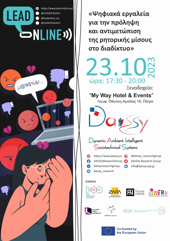 The DAISSy research group of the Hellenic Open University (HOU) invites to the info day on “Digital Tools to Prevent and Counter Hate Speech Online”, to be organized within the framework of the implementation of the LEAD-Online: Learn, Engage, Act: Digital Tools to Prevent and Counter Hate Speech Online European project.The activity takes place on Monday 23rd October 2023 at 17.30’, in Patras, Greece (“My Way” Hotel), providing also the possibility of online participation, through the zoom electronic platform.