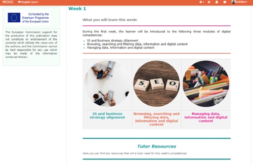 The MOOC aims at enhancing the digital skills and 21st century skills of museum and cultural professionals. To this end, it consists of training modules based on the European e-competences framework (e-CF), DigComp and P21 – in fact the course is a unique combination of these standards, and for this reason it is considered as best practice at European level. The instructional design was based on learning outcomes and is modular in order to allow each trainee to study based on his / her pace and availability. The MOOC extends to 8 weeks of training and requires a total of 80 hours of training and study. Each week, it focuses on 1 e-CF competence (a European standard of IT skills) and combines competences from DigComp (the global standard of digital literacy of the average citizen) and P21 (a 21st century skill model) frameworks. For each competence, a separate training module has been designed, the material of which is grouped in units.